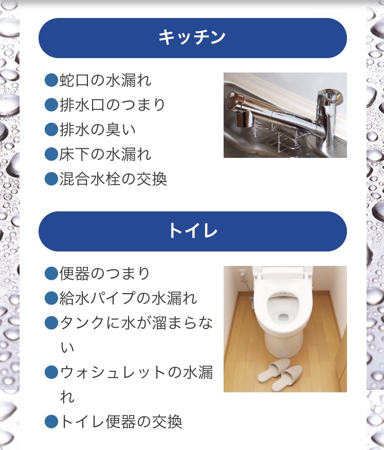 水漏れ 詰まり 蛇口 シングルレバー 単水栓 トイレタンク ボールタップ フロート レバー 止水栓 メーター 便器 和式 洋式 便座 ウォシュレット リモコン トイレつまり 排水つまり トイレに物を落とした 便器と床の間から水漏れ トイレの床下から水漏れ 便器交換 トイレリフォーム 洗面化粧台 三面鏡 洗髪シャワー 浄水器 お風呂 浴室 バスルーム 湯沸かし器 システムキッチン ユニットバス 給湯器 井戸ポンプ 深井戸 浅井戸 水中ポンプ ジェット 洗濯機 防水パン 移設 食器洗い乾燥機 食洗器 分岐 引っ越し TOTO INAX LIXIL KVK モエン サンエー 水が出ない お湯が出ない 水が止まらない 自分で対処法